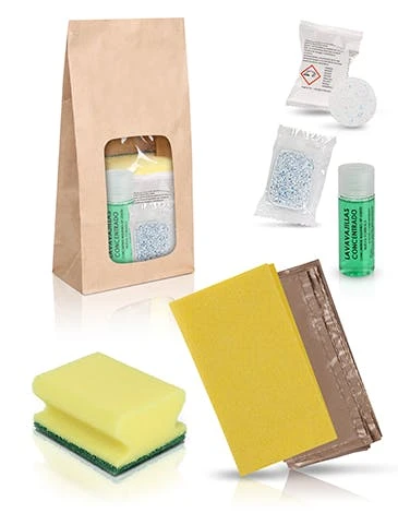 Inhalt: Die Bestellung umfasst 42 Reinigungssets. Jede Packung enthält: 1 gelben Putzlappen, 1 gelben Putzschwamm, 1 30 ml Flasche Spülmittel, 1 Spülmaschinentab, 1 Waschmaschinentab & 1 Müllbeutel.