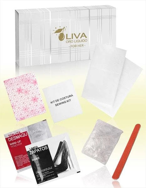 For Her D’Olive, besteht aus Nähset, Taschentücher, Abschmincktuch, Schuhtuch, Duschhaube und Nagelfeile.